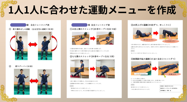 MOMOKAでは、これらの症状に合わせて理学療法士がマンツーマンでオーダーメイドのリハビリを提供しています。