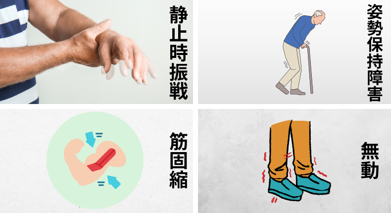パーキンソン病には、次の「4つの特徴的な症状(四大徴候)」があります。