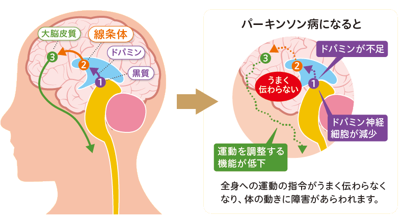 パーキンソン病は、脳の「黒質(こくしつ)」という部分でドーパミンを作る神経細胞が減っていくことで起こる病気です。